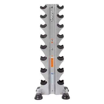 Show moreIntroduce an element of sophistication and organization to your home gym with the HOIST Fitness 8-pair Vertical Dumbbell Rack & Weight Storage Organizer. Designed exclusively to accommodate hexagonal dumbbells, this rack showcases a polypropylene-covered exterior that reduces noise and protects weights from wear and tear. The upgraded modern frame, crafted with durable oval tubing, emphasizes not only strength but also an aesthetic appeal that seamlessly blends into your workout space. Each unit comes with non-metallic foot covers to prevent scratches on your flooring, ensuring your investment is safe and your space remains pristine.