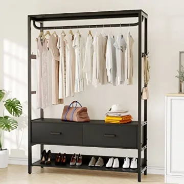 HOKEEPER Free Standing Closet Organizer with Drawers and Hooks, Heavy Duty Metal Clothes Clothing Garment Rack with Shelves Wardrobe Closet for Hanging Clothes Closet Storage Shelves for Bedroom Black