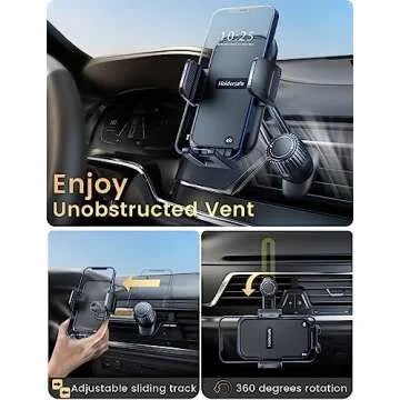 Show more The Holdersafe car vent phone holder is a must-have accessory for anyone on the go. Crafted with precision and designed with your convenience in mind, this expert car phone holder features movable slide rails and a 360° adjustable base. This ensures that your phone is positioned perfectly for optimal viewing without obstructing your car's A/C air vent. With its sleek and functional design, the Holdersafe car phone holder provides the ideal combination of style and practicality.