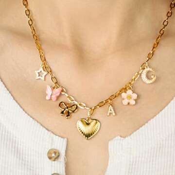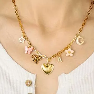 Show moreIntroducing the **HOLINSE Initial Charm Necklace for Women**, a stunning and personalized piece that celebrates individuality and style. This exquisite necklace features a beautifully crafted gold charm pendant adorned with an array of enchanting elements including a heart, bow, pink butterfly, flower, star, and moon. Set on a durable stainless steel chain plated with 14k gold, this necklace not only showcases stunning design but also ensures longevity and durability. The inlay of sparkling cubic zirconia adds a touch of elegance, making this necklace a perfect accessory for any occasion.