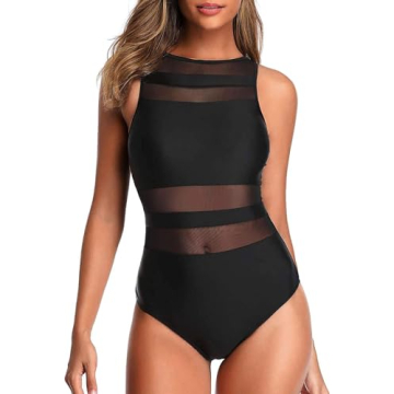 Holipick Women High Neck One Piece Swimsuits Mesh Bathing Suits Open Back Slimming Swimwear for Teen Girls Black M