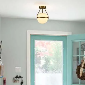 Show moreIlluminate your space with the HOLKIRT Modern Ceiling Light Fixture, a stunning blend of elegance and functionality that brightens any room with style. This Mid Century Semi Flush Mount Ceiling Light boasts a milky white globe glass shade that softens harsh lighting, while the brass finish of the metal body adds a touch of vintage charm reminiscent of classic designs. At just 8.45 inches in diameter and 11 inches in height, this piece is compact yet impactful, perfect for enhancing a variety of spaces in your home. Whether you're looking to revamp your bedroom, bathroom, kitchen, or hallway, this ceiling light fixture effortlessly complements your decor while providing ample light. It seamlessly merges elegance with modern sensibilities, making it a versatile choice for both traditional and contemporary interiors.