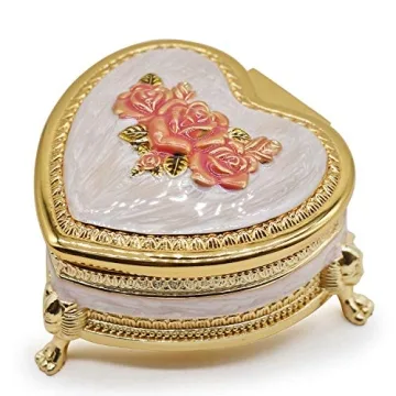 Show more Welcome to the world of elegance with the HOLLY TRIP Classic Vintage Heart Shape Metal Jewelry Box. Measuring a delightful 3.54 x 3.54 x 2.16 inches, this charming heart-shaped trinket box is handcrafted from durable zinc alloy and adorned with intricate classical retro flower patterns. Vibrant shades of gold and pink beautifully complement its stylish design, making it a perfect addition to any room or decor style. Not only does it serve as a functional storage solution for your precious earrings, rings, or keepsakes, but it also stands out as a stunning decorative statement piece that encapsulates timeless vintage charm.