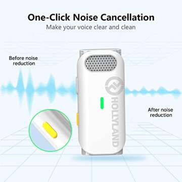 Show more Experience crystal clear audio recording with the Hollyland Lark M1 Wireless Lavalier Microphone. This advanced device incorporates cutting-edge DSP Noise Cancellation technology to filter out unwanted ambient sounds with just one click. Its high-performance audio quality is further enhanced by the LC3 Codec technology and a remarkable 48kHz/16bit sampling rate, ensuring superb clarity in various recording environments. Whether you're creating content for digital platforms or capturing moments during a live event, this microphone stands out as a reliable option.