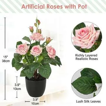 Hollyone Artificial Plants & Flowers in Vase Pink Roses Artificial Flowers Potted Plant Faux Silk Flower with Pot Fake Rose Flower Arrangement Home Decor Office Bathroom Shelf Desk Decoration 15 Inch