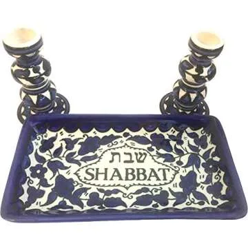 Holy Land Market Shabbat Candlestick Set - Colorful Ceramic Candlesticks with Matching Plate for Shabbat and Holidays (Blue)