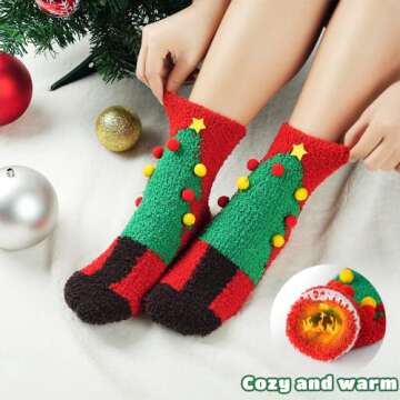 Show moreExperience ultimate coziness this holiday season with the Homaisson Women’s Christmas Fuzzy Socks. Designed to warm your feet during chilly winter nights, these soft and cute socks bring festive cheer right into your home. Each pack comes with three delightful pairs, showcasing adorable 3D Christmas patterns including Santa Claus, Christmas trees, and snowmen, making them perfect for both lounging and entertaining during the holidays.