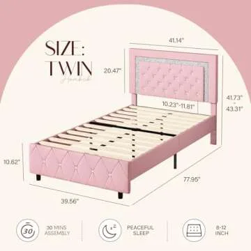 Show moreIntroducing the ultimate blend of elegance and comfort - the HOMBCK Twin Bed Frame. This luxurious pink twin bed frame is designed with modern style and functionality in mind, making it a delightful addition to any bedroom. With its stunning diamond tufted upholstery wrapped in chic faux leather, it adds a touch of glam that your daughter will adore. The sparkling diamonds encompassing the headboard bring a striking visual flair, perfect for those who wish to inject a bit of sparkle into their decor. Most notably, it doesn’t just look great; it’s built to last, offering both durability and style for years to come.