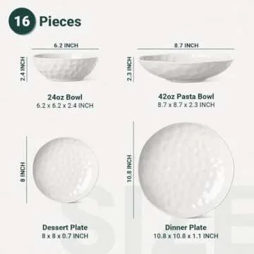 Show more Indulge in the elegance and durability of our exquisite LARGER Dinnerware Set, crafted to elevate your dining experience. Designed for four, the set includes four 10.8” dinner plates, 8” dessert/appetizer plates, 8.75” pasta bowls, and 6.25” cereal bowls. Made from high-quality porcelain, this dinnerware set boasts a stunning sun-glitter inspired design, combining functionality with a sophisticated aesthetic that will enhance any table setting. The smooth, non-porous surface is perfect for salads, pasta, soups, and fruits, ensuring that each meal is served beautifully and hygienically.