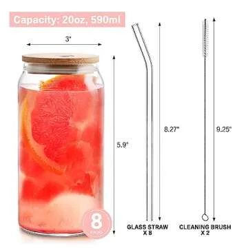 HOMBERKING Glass Cups with Bamboo Lids and Straws 8pcs Set, 20oz Cups, Beer Glasses, Iced Coffee Cups, Cute Tumbler with 2 Cleaning Brushes, Ideal for Cocktail, Whiskey, Tea, Gift