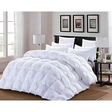 Show more Experience the ultimate in comfort and style with the HOMBYS Feather and Down Comforter. Designed specifically for king-size beds, this luxurious comforter features a captivating pinch pleat design that adds an elegant touch to your bedroom decor. Made with a 100% cotton shell, it is not only down-proof but also soft and breathable, ensuring that you enjoy a sweat-free sleep all night long. Weighing in at 69 ounces, this fluffy comforter provides just the right amount of warmth for all seasons, effectively regulating your body temperature for a cozy night’s rest.
