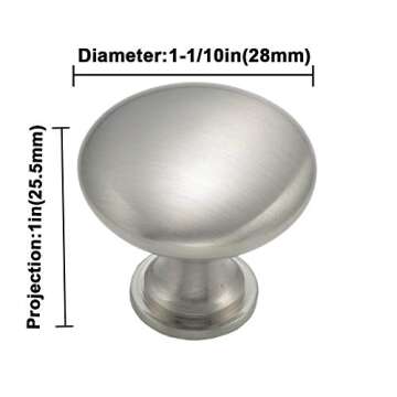 Show more The PACK of 5 Round Cabinet Knobs with Satin Nickel Finish is the epitome of elegance and functionality for any home. Crafted from high-quality zinc alloy material, these knobs promise durability while enhancing the aesthetic of your interiors. With a diameter of 1-1/10 inches and a projection of 1 inch, they’re designed to provide a comfortable grip and sophisticated look that seamlessly fits into modern minimalism or classic decor themes.