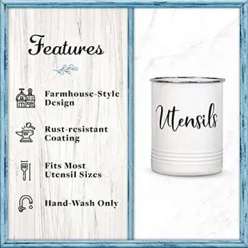 Show moreIntroducing the Home Acre Designs Vintage Farmhouse Utensil Holder, your new kitchen essential that combines style and functionality. This delightful utensil holder is not just a practical addition to your kitchen but also a statement piece that adds rustic charm to your decor. Crafted with a durable stainless steel rim, it's designed to withstand everyday use while providing a modern twist to its vintage aesthetic. Measuring 6.7" X 5.4", it offers ample space for all your essential kitchen utensils—think spatulas, ladles, tongs, and more—while ensuring it remains compact enough for even the smallest countertops.