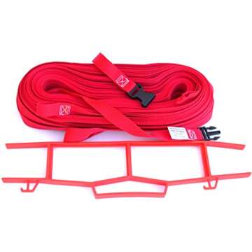 Introducing the Home Court 1-inch Non-Adjustable 30-ft Sand Setup Boundary in vibrant red! Expertly designed for sand play setups, this robust boundary system is perfect for a variety of outdoor activities, whether it's creating a playground for kids or outlining sports practice areas. Easy to install and remove, its durable 1-inch webbing spans 30 feet, providing ample space for fun and games, all while packing conveniently into an included storage holder.