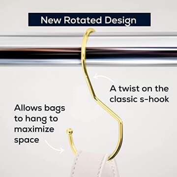 Show more Transform the way you organize your handbags and accessories with our innovative Purse Hooks for Closet. This unique storage solution eliminates the hassle of dusty floors and hard-to-reach spaces, allowing you to store and showcase your prized handbags effortlessly. The thoughtful design features a twisted S hook that displays your bags side by side at eye level, making it easy for you to select the perfect bag for any occasion. No more rummaging through boxes or digging under your bed - everything is right in front of you!