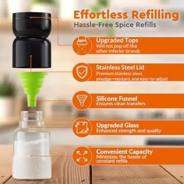 With a generous capacity of 1/2 cup, this shaker set is ideal for everyday use, minimizing the need for frequent refills. The transparent glass construction lets you easily monitor contents, ensuring you’ll never run out unexpectedly. Easy to clean and refill, the wide opening of the glass shakers and the removable stainless steel lid make for a completely mess-free experience. Enjoy your favorite seasonings, whether it's Himalayan salt, kosher salt, or ground peppercorns, in a modern design that complements any kitchen decor, particularly perfect for a farmhouse aesthetic.