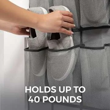 Show moreIntroducing the HOME GENIE Over the Door Hanging Shoe Organizer – your new best friend in maximizing storage space while keeping your shoes, accessories, and household items within easy reach! This brilliantly designed organizer is crafted to hold up to 40 pounds, making it perfect for storing a wide array of items, from shoes and beauty products to cleaning supplies and craft materials. Measuring 64 by 19 inches with each pocket being 7.8 by 4.3 inches, it packs plenty of room to accommodate all your necessities while maintaining a sleek look in elegant gray. Constructed from durable non-woven fabric with reinforced stitching, this organizer promises long-term use and reliability.
