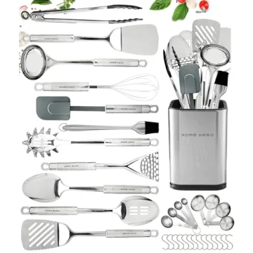 Elevate your cooking experience with the Home Hero 32-Piece Stainless Steel Kitchen Utensils Set. Unlike flimsy alternatives that crack or melt under pressure, our premium collection is meticulously crafted from high-quality stainless steel and silicone to ensure durability and longevity. Whether you are preparing a quick breakfast or a gourmet dinner, this set includes the essential tools you need. Featuring a variety of utensils such as a skimmer, slotted spatula, garlic press, cheese knife,...