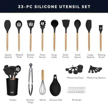 Show more The Home Hero 33-Piece Complete Kitchen Utensils Set is the ultimate companion for both seasoned chefs and home cooking enthusiasts alike. This premium kitchen set includes a comprehensive assortment of essential tools, such as a Solid Spoon, Slotted Spoon, Solid Turner, Slotted Turner, Pasta Server, Soup Ladle, and more. Each item is crafted from BPA-free, food-grade silicone, ensuring that every meal is safe and delicious.