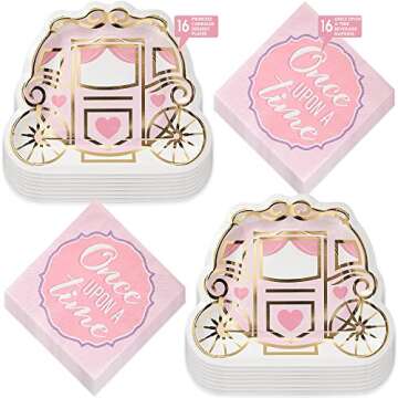 Transform any gathering into a whimsical fairytale with our HOME & HOOPLA Princess Party Pink and Gold Metallic Carriage Shaped Paper Dessert Plates and Once Upon a Time Beverage Napkins. This enchanting set includes 16 beautifully designed paper dessert plates and an equal number of matching beverage napkins that evoke the charm of a royal celebration. The plates feature an adorable pink carriage embellished with striking metallic gold accents, while the napkins boast a charming "Once Upon...