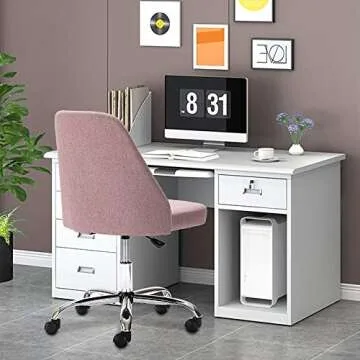 Show more Transform your workspace or study area with our stunning upholstered desk chair that perfectly combines modern design with unparalleled comfort. Unlike traditional office chairs clad in dull black leather or basic mesh, this chair boasts a chic linen upholstery that enhances the aesthetic of any room. From your bedroom to your home office, this chair is versatile enough for various settings such as makeup corners, reading nooks, or sewing rooms.