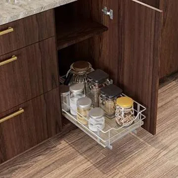 Home Zone Living Pull Out Kitchen Cabinet Organizer with Slide Out Drawer for Space Saving Storage, 11”W x 21”L, Satin Nickel Light Brown Wood Finish