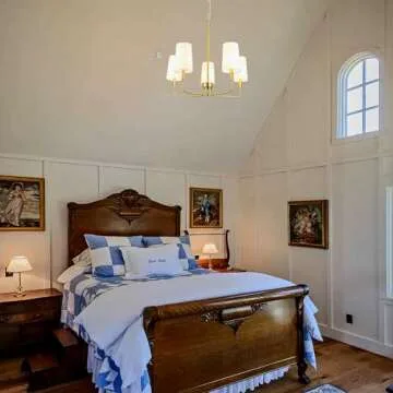 Homebelife Chandelier, Brushed Brass with White Fabric Shade, Farmhouse Linear Island Lighting Fixture for Kitchen, Dining Room (5-Light Brass Gold with Fabric Shades)