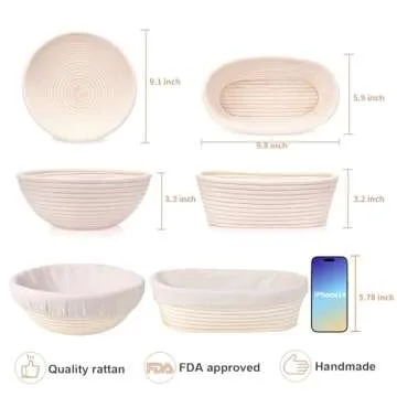 Show more Introducing the HOMEDISIAC Banneton Bread Proofing Basket Set, your essential companion for a delightful baking experience! Crafted from 100% natural rattan, these baskets feature exquisite craftsmanship that not only looks beautiful but is also designed for optimal functionality. The round basket measures 9 inches in diameter and 3.5 inches high, while the oval basket is 10 inches long, 5 inches wide, and 3 inches high, allowing you to create different shapes of artisan loaves with ease. Versatile enough to support up to 1.5 pounds of dough, you can effortlessly bake your favorite sourdough breads.