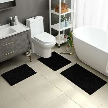 HOMEIDEAS 3 Pieces Bathroom Rugs, Ultra Soft Non Slip Absorbent Chenille Toilet Bath Mat Set (Black)