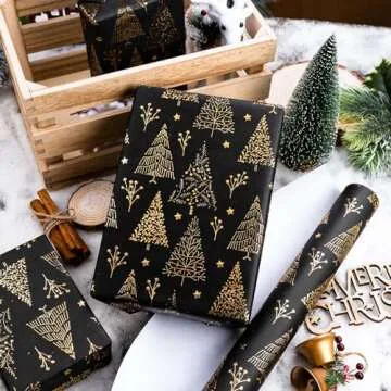 Homeral Christmas Wrapping Paper Roll - 46.8 sq.ft. 3D Embossed Gold Foil Christmas Tree, Star on Black for Christmas, New Year Celebration, Holiday - 17in x 33ft