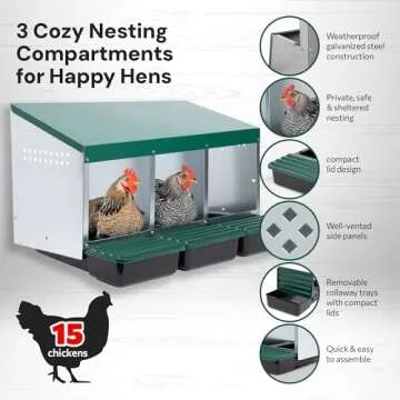 The **Homestead Essentials 3 Compartment, Forward Rollout & Rollaway Hen & Chicken Nesting Box** is the perfect solution for poultry enthusiasts looking to elevate their hen housing experience. Designed with the utmost attention to detail, this nesting box is made from high-quality **galvanized steel**, ensuring durability and stability over time. With its versatile design, it accommodates medium to large hens comfortably, making it an ideal choice for any backyard flock.