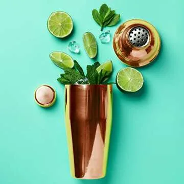 Show moreIntroducing the essential Homestia 9 Pcs Copper Cocktail Shaker Set, a perfect blend of beauty and functionality designed for cocktail enthusiasts and casual drinkers alike! This stunning set is not merely an eye-catching addition to your countertop but also a reliable companion in your kitchen or home bar. Constructed from high-quality stainless steel with a lustrous copper finish, this cocktail shaker set is crafted to impress and perform. It includes a generous 24oz shaker, powerful blender balls, and essential tools like a muddler, spoon, double jigger, fine strainer, and two liquor pour spouts, making it an all-in-one bartending solution.