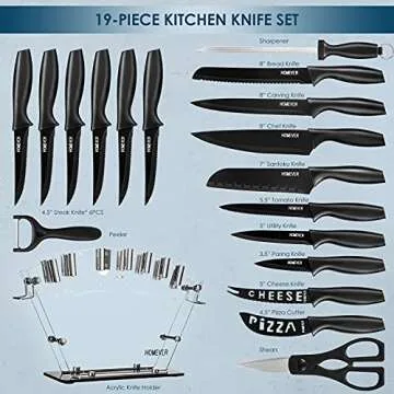 Show more Discover the ultimate cooking companion with the Homever Kitchen Knife Block Set, a 19-piece ensemble crafted to meet all your culinary needs. This impressive set features a collection of superior quality stainless steel knives, each designed to provide optimal performance, precision, and style. From the sleek acrylic stand that complements any kitchen decor to the sharp, durable blades coated for ease of use, this set stands out not only for its exceptional functionality but also for its aesthetic appeal. Imagine cooking with confidence, knowing that each cut, slice, and chop is executed effortlessly with these beautifully crafted tools.