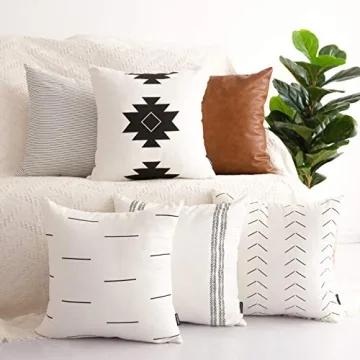 Show more Transform your living space with the HOMFINER Decorative Throw Pillow Covers, a stunning set of 6 pillow covers that seamlessly blend style and functionality. Designed for contemporary aesthetics, each pillow cover measures 18x18 inches, making them a perfect fit for standard pillow inserts. Crafted from a mix of premium materials, including 100% natural cotton woven fabric and high-quality vegan faux leather, these covers promise a luxurious feel and lasting durability. Whether you’re decorating your living room, bedroom, or office, these covers add an instant designer touch to any setting.