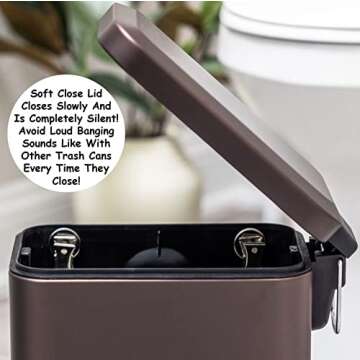 Show moreIntroducing the Homie Soft Close Slim Trash Can, a perfect blend of functionality and elegance for your home. This 1.6-gallon mini garbage basket features a unique soft-close lid that operates silently, ensuring no disruptive noise while you manage waste in your space. Constructed with premium-grade materials, this sleek and stylish trash can is not just a utility but also an attractive addition to any room, from your bathroom to your kitchen and beyond. The smart design allows for easy use with any standard-sized trash bag, eliminating the hassle of custom liners and saving you money.