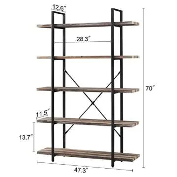 Show more The Industrial Bookshelf is a stunning blend of functionality and aesthetic charm, featuring a 5-tier design that complements any room with its minimalist appeal. Crafted from high-quality MDF wood and a robust metal frame, this bookshelf showcases a charming rustic faux woodgrain finish that adds a touch of elegance to your home decor. Its sturdy construction is reinforced with an X-shaped structure at the back, ensuring exceptional durability and stability. The adjustable feet provide added support on uneven floors, making it a perfect addition to any space.