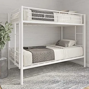 Show more Introducing the HomJoones Metal Bunk Bed, an exceptional solution for maximizing space while providing a stylish and comfortable sleep arrangement for your kids, teens, or even adults. Featuring a modern white finish, this bunk bed seamlessly blends with various bedroom décors, making it perfect for shared rooms, dormitories, or guest accommodations. The sturdy metal frame construction combines strength and elegance, ensuring it can withstand the adventures of multiple users. The design includes rubber pads on the legs, protecting your floors from scratches and damage.