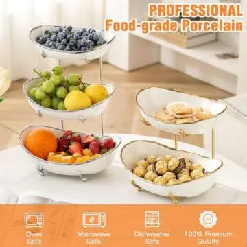 HOMKULA Fruit Bowl for Kitchen Counter - 3 Tier Ceramic Serving Bowls with Metal Stand, Tiered Fruit Basket for Fruit Vegetable Storage, Snack, Nuts, Cake, Dessert, Small & Cute (Gold-Rimmed)
