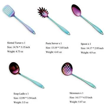 One of the standout features of this set is its stunning rainbow color, achieved through an advanced electroplating technique using titanium. Each utensil's handles shimmer with a captivating iridescent blend of purples and greens, adding a pop of color to your kitchen countertop. Users have noted how the colors seem to change under different lighting, evoking a whimsical vibe that’s perfect for entertaining guests or simply brightening up your cooking space.