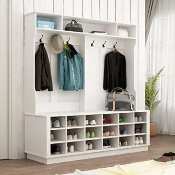 Homsee Extra Wide Modern Hall Tree with Storage Bench, 4-in-1 Entryway Bench with Coat Rack, Tall Hall Tree with 6 Metal Hooks, Shelves & 18 Storage Cubes for Hallway, Living Room, White