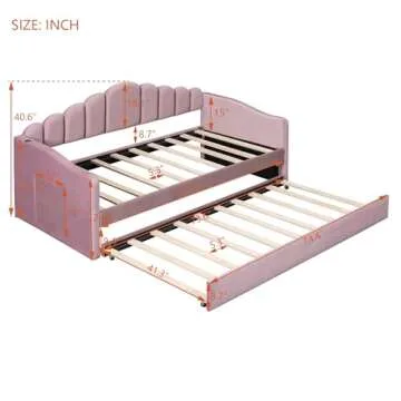 Show moreThe **HomSof Twin Size Upholstered Daybed with Trundle** is an epitome of style and functionality, blending an elegant design with modern conveniences. Crafted from exquisite velvet fabrics, this beautifully designed sofa bed is available in charming shades of pink that seamlessly complement any decor. The unique vertical stripe backrest, combined with plush armrests, not only adds a touch of sophistication but is built to withstand the test of time without falling out of fashion. Perfect for those who appreciate both aesthetics and durability, this daybed also features a soft fabric headboard that enhances comfort when lounging or relaxing.