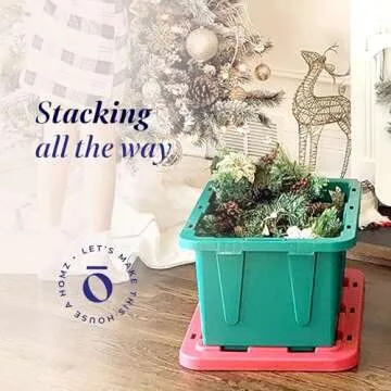 Show moreTransform your home into a haven of holiday cheer with the HOMZ 4-Pack Durabilt Heavy Duty Plastic Storage Bins with Lids. These vibrant green and red totes are the perfect solution for managing your festive decorations, ensuring your seasonal items are secure and organized. With a solid capacity of 15 gallons, each tote comes equipped to store everything from ornaments and wreaths to lights and stockings. Made from shatter-, dent-, and blemish-resistant materials, these rugged bins stand strong against the wear and tear of everyday use. Measuring 26" L x 17.75" W x 12.25" H, they offer ample space without compromising your home’s aesthetics. Designed for effortless stacking, these stacks not only save space but also allow you to take your holiday storage to new heights.