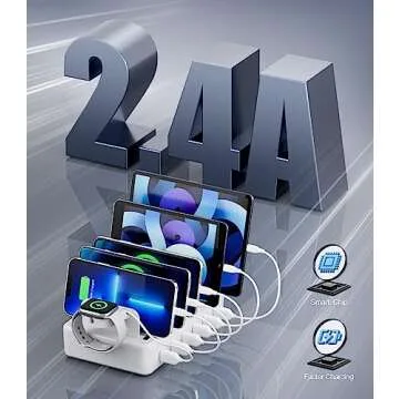 Show moreIntroducing the Honcila Charging Station for Multiple Devices: Say goodbye to tangled cords and missed charges with this sleek and efficient 6-port charging dock. Designed for modern families, tech enthusiasts, and anyone juggling multiple devices, this charging station offers a compact solution that doesn’t compromise on power or speed. With the ability to charge up to six devices simultaneously, including smartphones, tablets, Airpods, and smartwatches, it’s the ultimate all-in-one power hub. The thoughtful inclusion of three types of charging cables ensures you have everything you need right at your fingertips. Enjoy fast charging thanks to a smart chip that identifies each connected device and delivers the optimal current, ensuring every gadget gets exactly what it needs when plugged in.