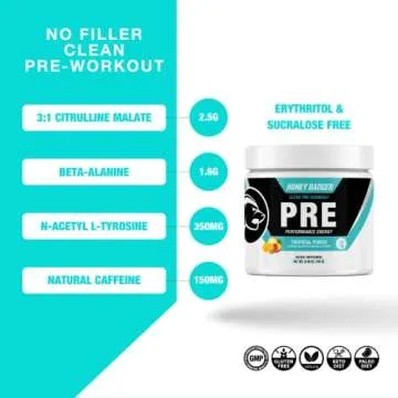 Honey Badger Pre Workout Powder, Keto Vegan Preworkout for Men & Women with Vitamin C for Immune Support, Beta Alanine & Caffeine, Sugar Free Natural Energy Supplement, Tropical Punch, 30 Servings