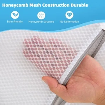 Show more Introducing the Honeycomb Mesh Laundry Bags for Delicates, a must-have solution for anyone who values the longevity of their favorite garments and accessories. Measuring a convenient 12x16 inches, these heavy-duty laundry bags are crafted from reinforced 120g honeycomb mesh fabric, designed to shield your bras, lingerie, delicates, socks, and even baby clothes from the rigors of the washing machine. The unique honeycomb structure allows for optimized water flow and detergent penetration, ensuring a deep clean without the wear and tear that leads to snags, tears, or stretching. With premium anti-rust zippers equipped with auto-lock technology, you can trust that your items remain securely enclosed throughout the wash cycle.