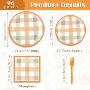 Show more Welcome to your ultimate autumn celebration with the **Honeydak 96 Pcs Fall Orange Plaid Party Supplies**. This delightful set includes everything you need to host an unforgettable Thanksgiving gathering, accommodating up to **24 guests**. The package features **24 durable 9-inch plates**, **24 7-inch plates**, **24 napkins** (approx. 6.5 inches), and **24 forks**, ensuring that every guest is well taken care of. Designed not just for functionality, but also for festivity, each piece showcases a charming plaid design that resonates with cozy fall vibes. Crafted from high-quality, *waterproof paper*, this dinnerware set is completely safe and non-toxic, ready to withstand your hearty Thanksgiving meals without compromising on style.