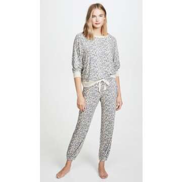 Perfectly tailored for a flattering fit, this sleepwear set boasts a length of 22.75 inches, a rise of 10.75 inches, and an inseam of 29.25 inches. Designed with long raglan sleeves, it offers enhanced mobility and elegance. Available in a stylish natural leopard print against a calming grey background, this pajama set promises to be your new favorite nighttime ensemble.