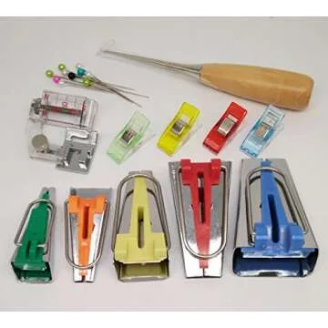 The kit includes five bias tape makers, four craft clips, a binder foot, an awl, and ten quilting pins, ensuring you have everything you need.
