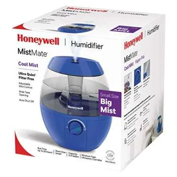 Show moreThe Honeywell HUL520L Mistmate Cool Mist Humidifier in a soothing blue finish is your go-to solution for creating a more comfortable environment in small rooms and personal spaces. Its brilliantly engineered design allows it to quietly produce a fine, visible cool mist, helping you combat dry air whether you're at home or in the office. Featuring user-friendly controls for easy operation, along with variable output settings to customize your mist experience, this humidifier is perfect for enhancing your living or working conditions.