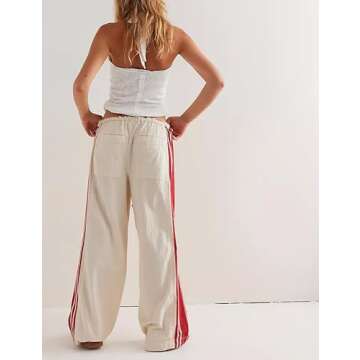 Hongsui Women's Wide Leg Pants Drawstring High Rise Side Striped Slouchy Palazzo Pants with Pockets (Beige-Small)